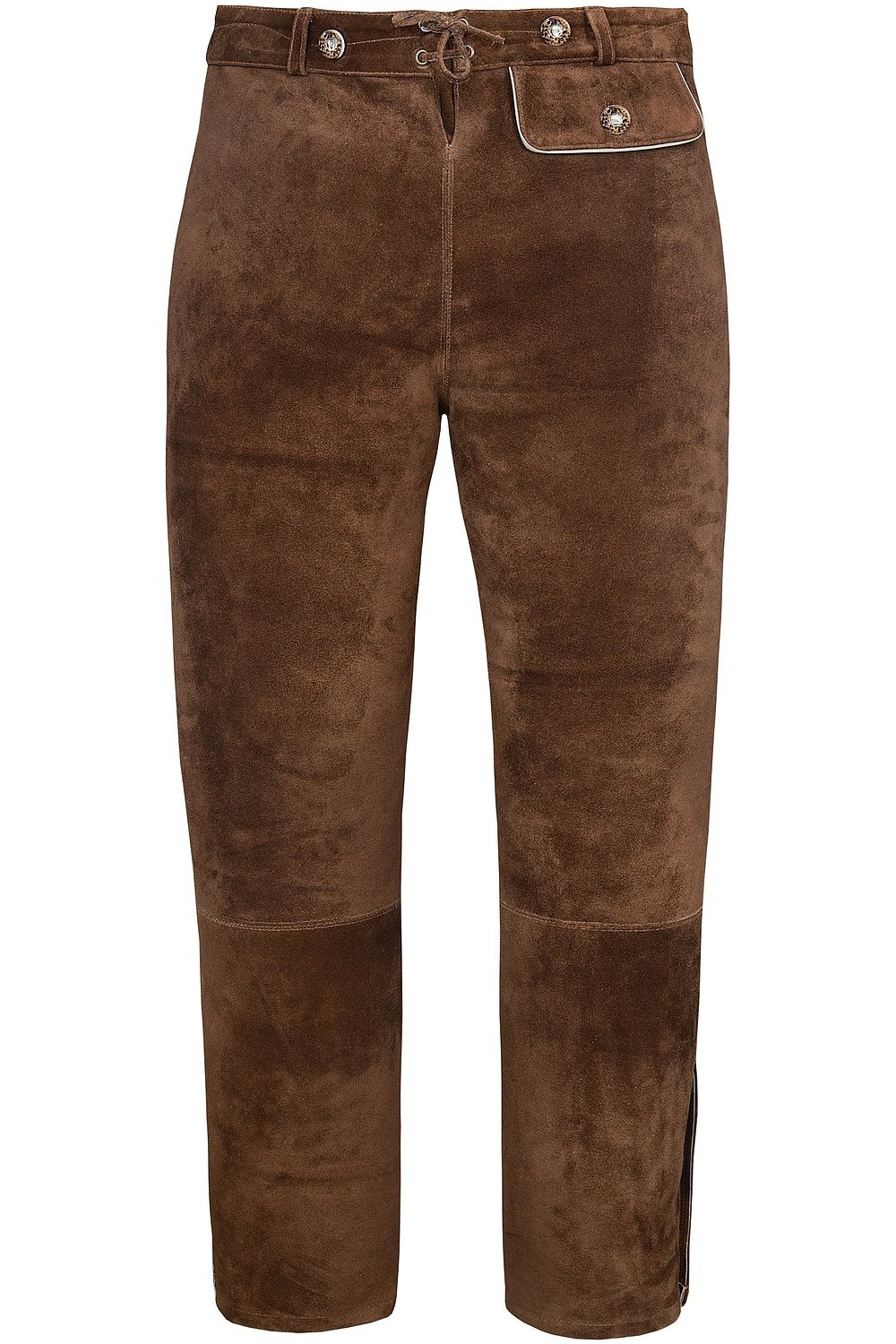 Long traditional lederhosen, in the colour medium brown, with noble and discreet embroidery on the side of the trouser leg.